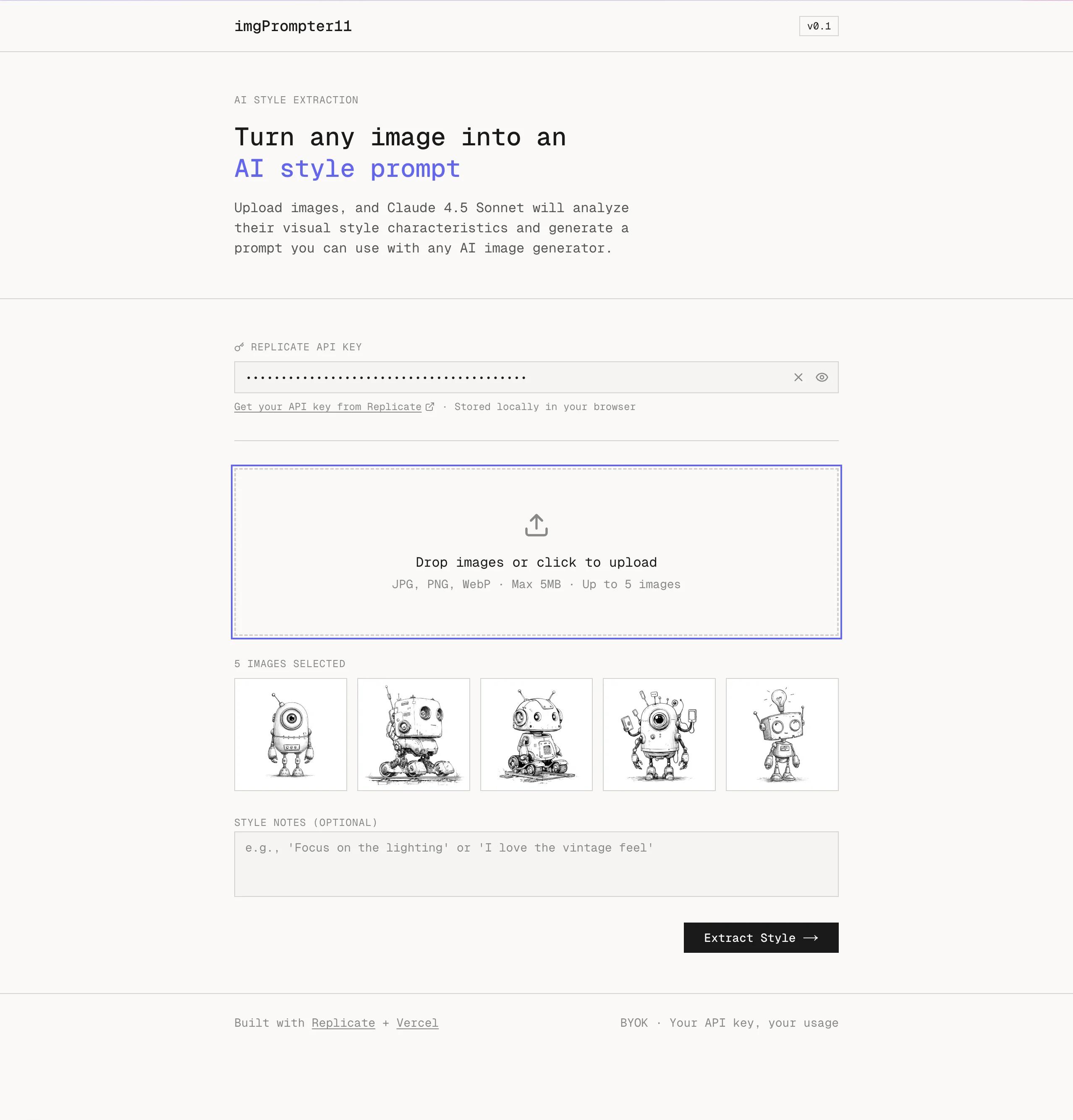 imgPrompter11 is an AI-powered tool that extracts style prompts from images. Upload reference images, and Claude 4.5 Sonnet analyzes them to generate prompts for Midjourney, DALL-E, or Stable Diffusion.